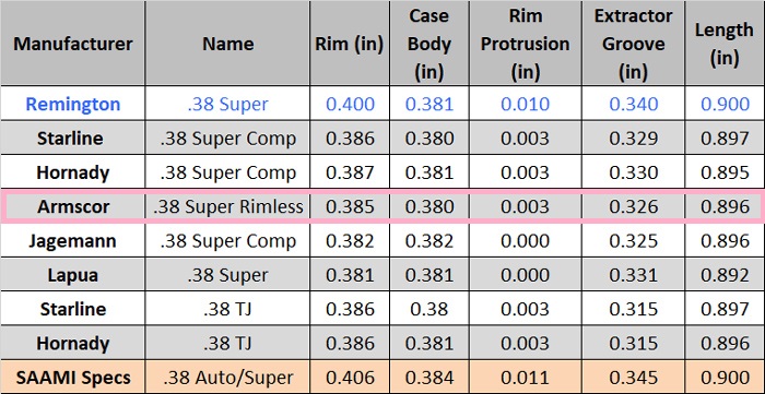Armscor calls their rimless cases rimless (RL on the headstamp), not Super Comp. Like the Starline and Hornady versions, they have a mini-rim. The rim measures the same diameter as the case body— 0.382 inch. They are like Lapua’s version of the .38 Super—the rim and the case body both measure 0.381 inch.